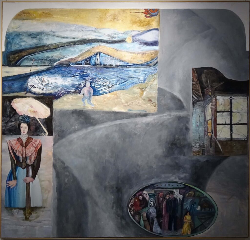 • The lower section, titled “The Old Man and the Sea,” features an elderly figure (visually appearing as a woman with white hair) in a red hood, overlooking a landscape with water. This part of the painting represents wisdom and legacy. It describes her wisdom as being “like the sea,” vast and accumulated over a lifetime.