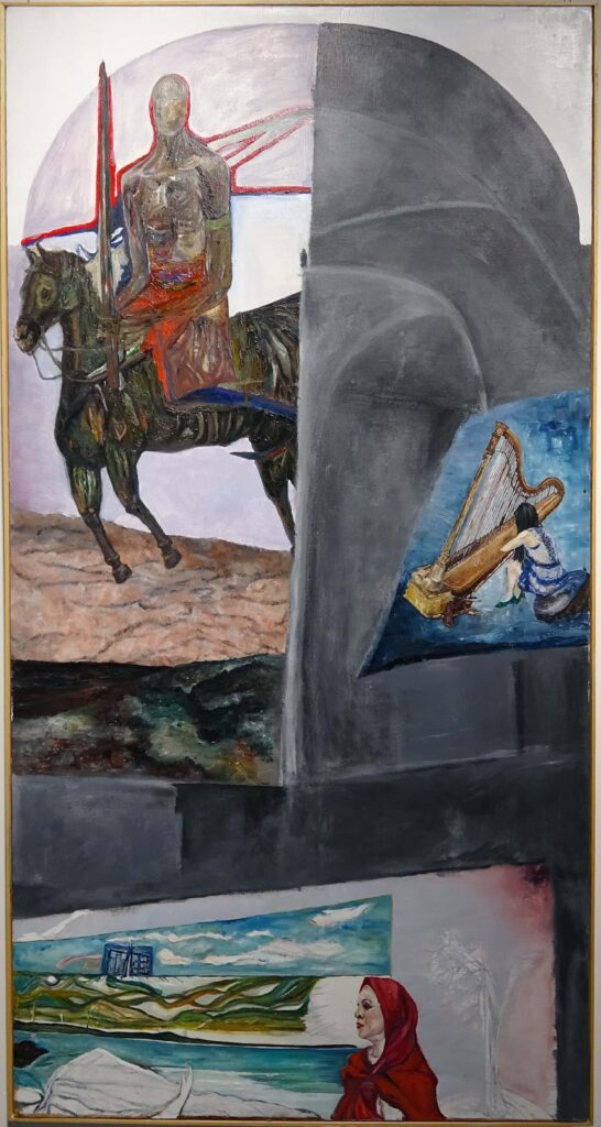 • The upper left section depicts a “knight” on horseback, bearing a sword. This figure, shown with anatomical detail, symbolizes the universal and inescapable force of death. It emphasizes that this knight marks “the beginning of the end for humanity,” signifying that death is an equalizer, affecting all people regardless of their deeds in life, and is ultimately unbeatable.