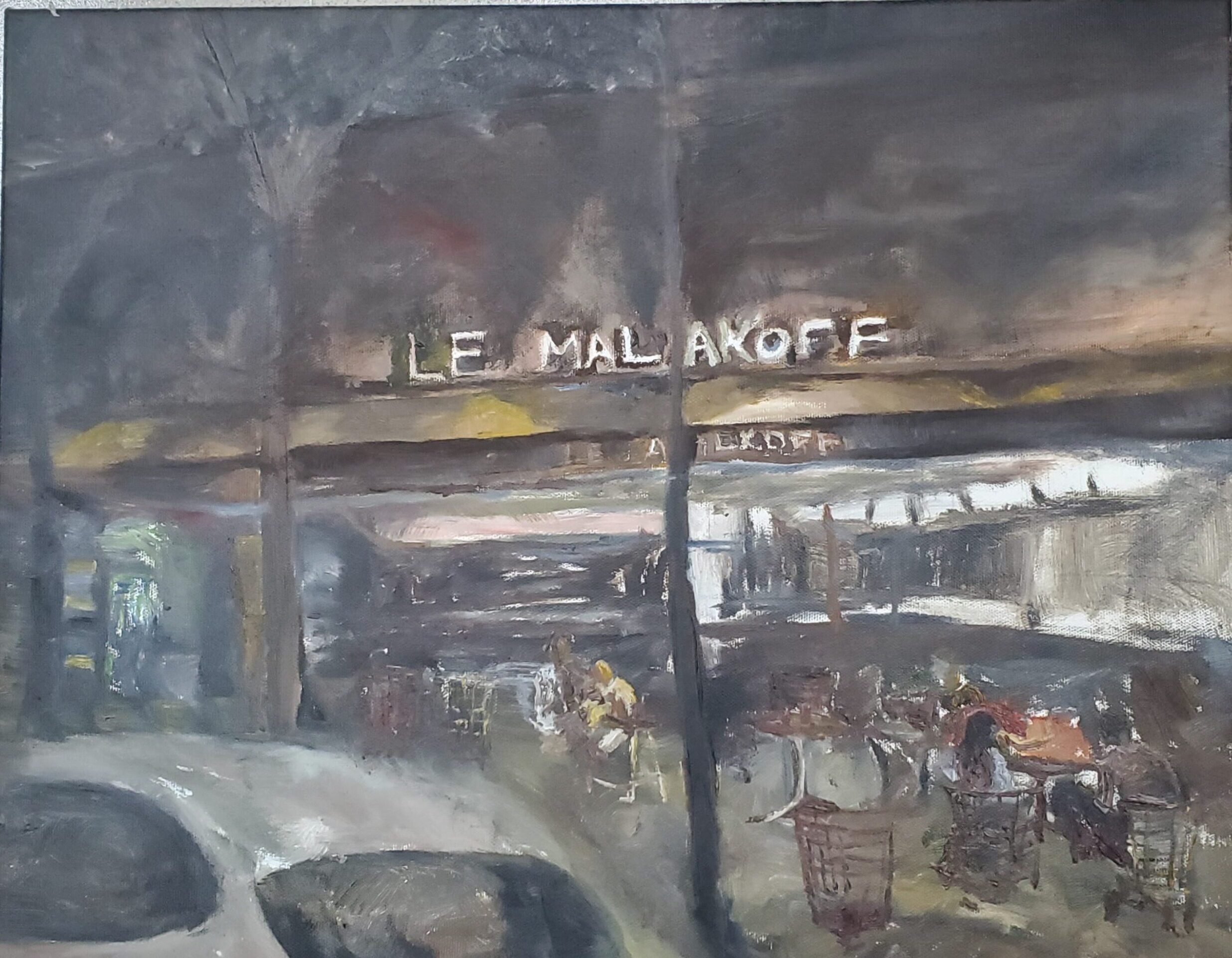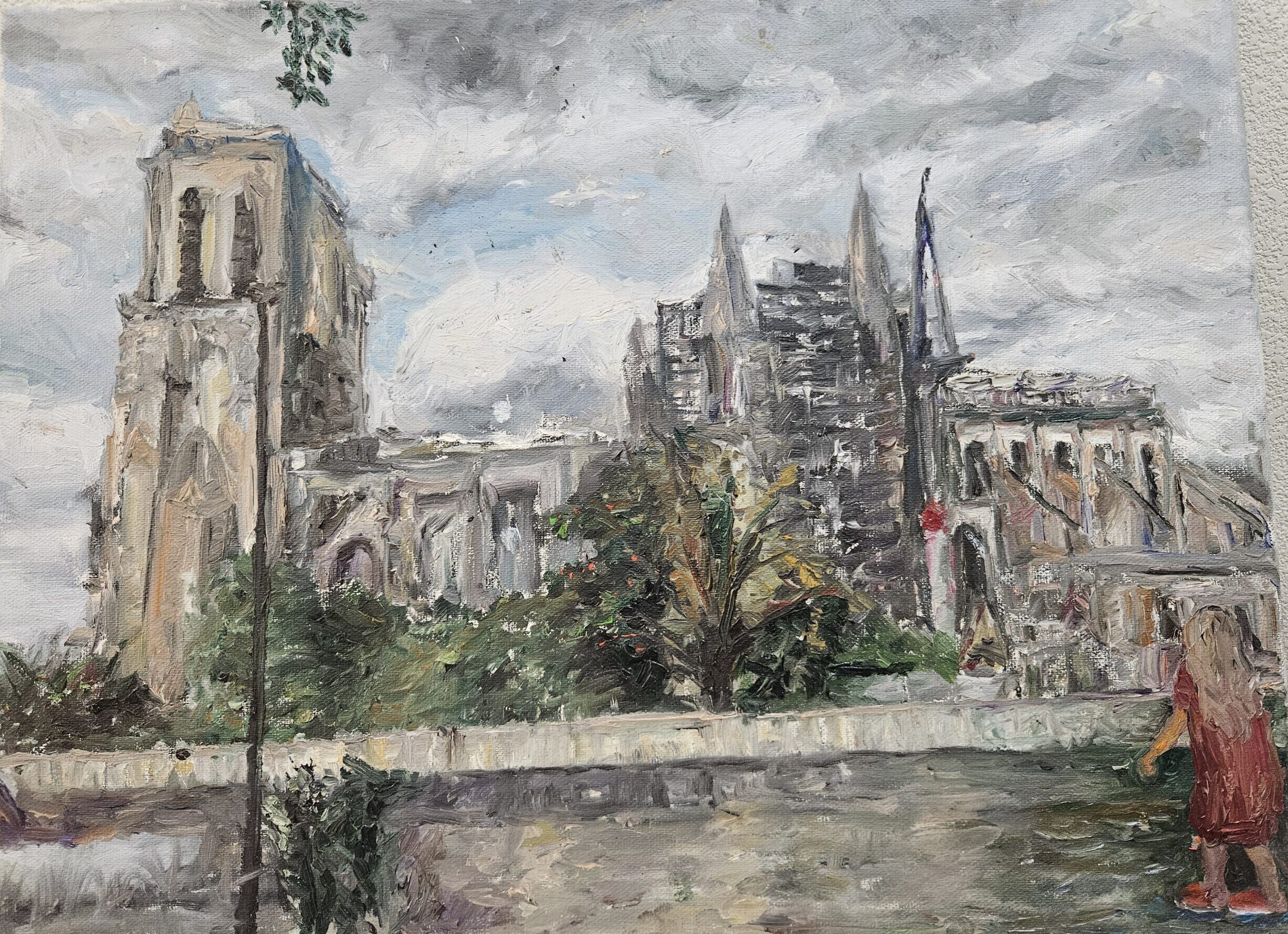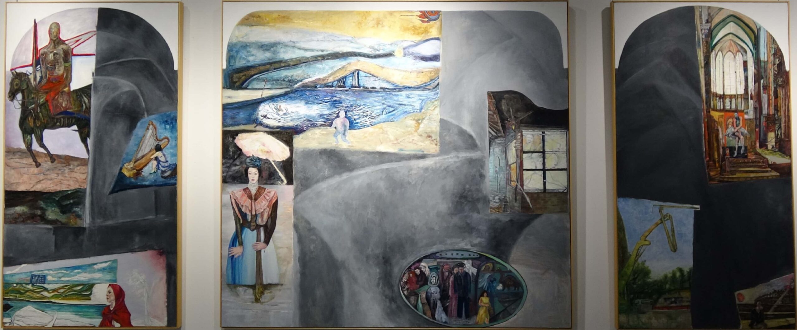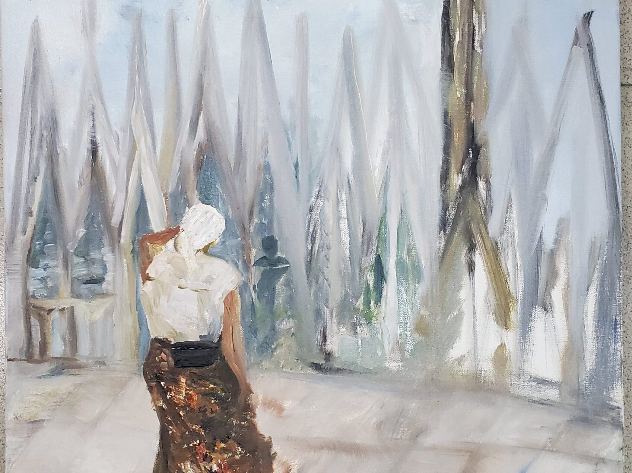 • The lower section, titled “The Old Man and the Sea,” features an elderly figure (visually appearing as a woman with white hair) in a red hood, overlooking a landscape with water. This part of the painting represents wisdom and legacy. It describes her wisdom as being “like the sea,” vast and accumulated over a lifetime.